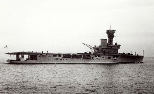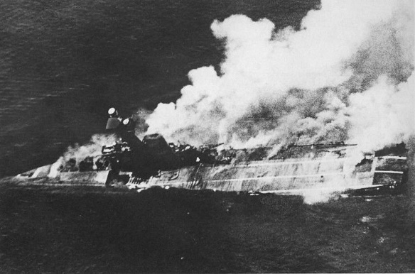 “HERMES while operating south of Trincomalee at 23 knots was attacked and sunk by Japanese aircraft. At 1035 the first bombs struck the ships hits being registered aft and on the forward aircraft lift. From this time on HERMES was repeatedly hit. Both boiler rooms were put out of action and the forward aircraft lift was wrecked. At 1050 the ship was immobilised, on fire and had a heavy list to port. At 1055 HERMES capsized to port and sank.”